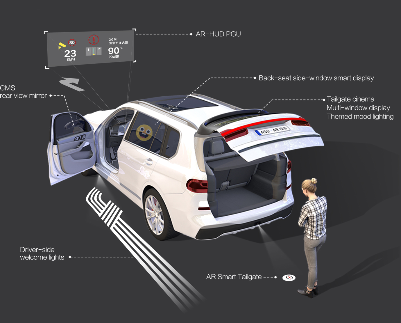 ASU is focused on developing and researching relevant technologies for smart automobiles, integrating optical technologies into automotive user scenarios, and has achieved remarkable results in the aspects of smart interior and V2H interaction. ASU has independently developed a range of products including AR-HUD PGU, LFP welcome light (carpet), and AR tailgate to create a complete set of automotive smart display scenarios. Automotive grade applications of the LCoS technology include the in-car projector and the AR-HUD. The list of our collaboration partners includes BAIC, FAW, Great Wall, Dongfeng, and Chery Automobile.