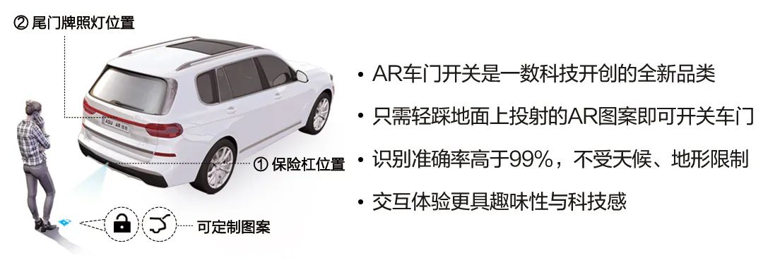 日常用车场景中,手抱重物状态下想开启车门显得十分不便,市面上现存的“一脚踢”又存在识别不精确的问题以及“尾门打脸”的隐患。一数创造的AR尾门开关可以彻底解决这些痛点。