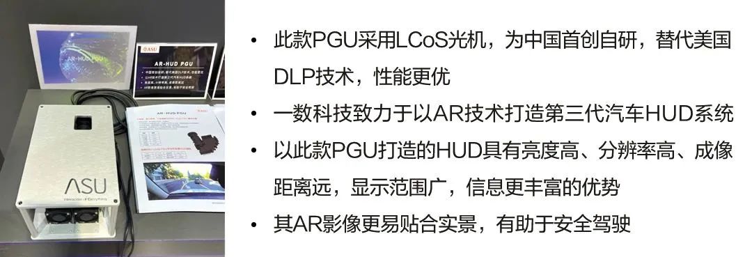 一数科技专注于汽车智能化领域的技术开发研究,而HUD系统无疑是智能汽车驾驶舱中的核心设备。车展现场展示了一数采用自主研发的LCoS投影光机打造的AR-HUD PGU。